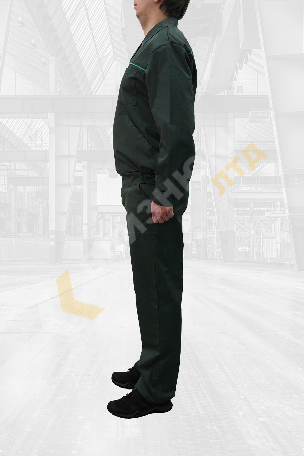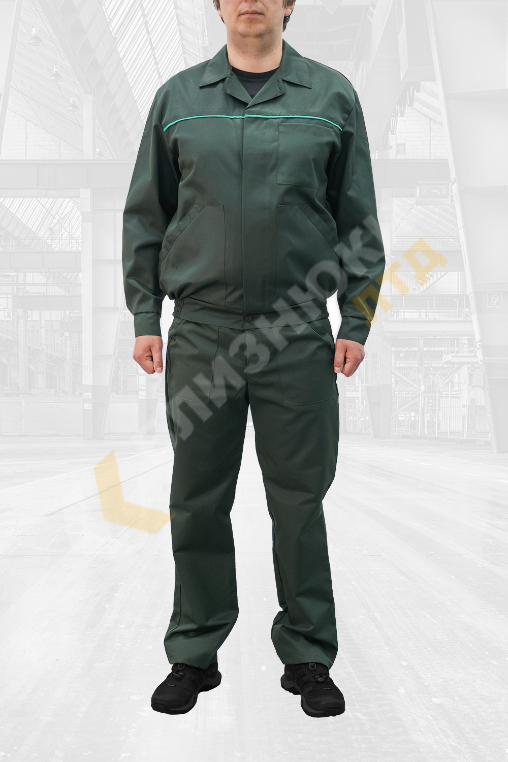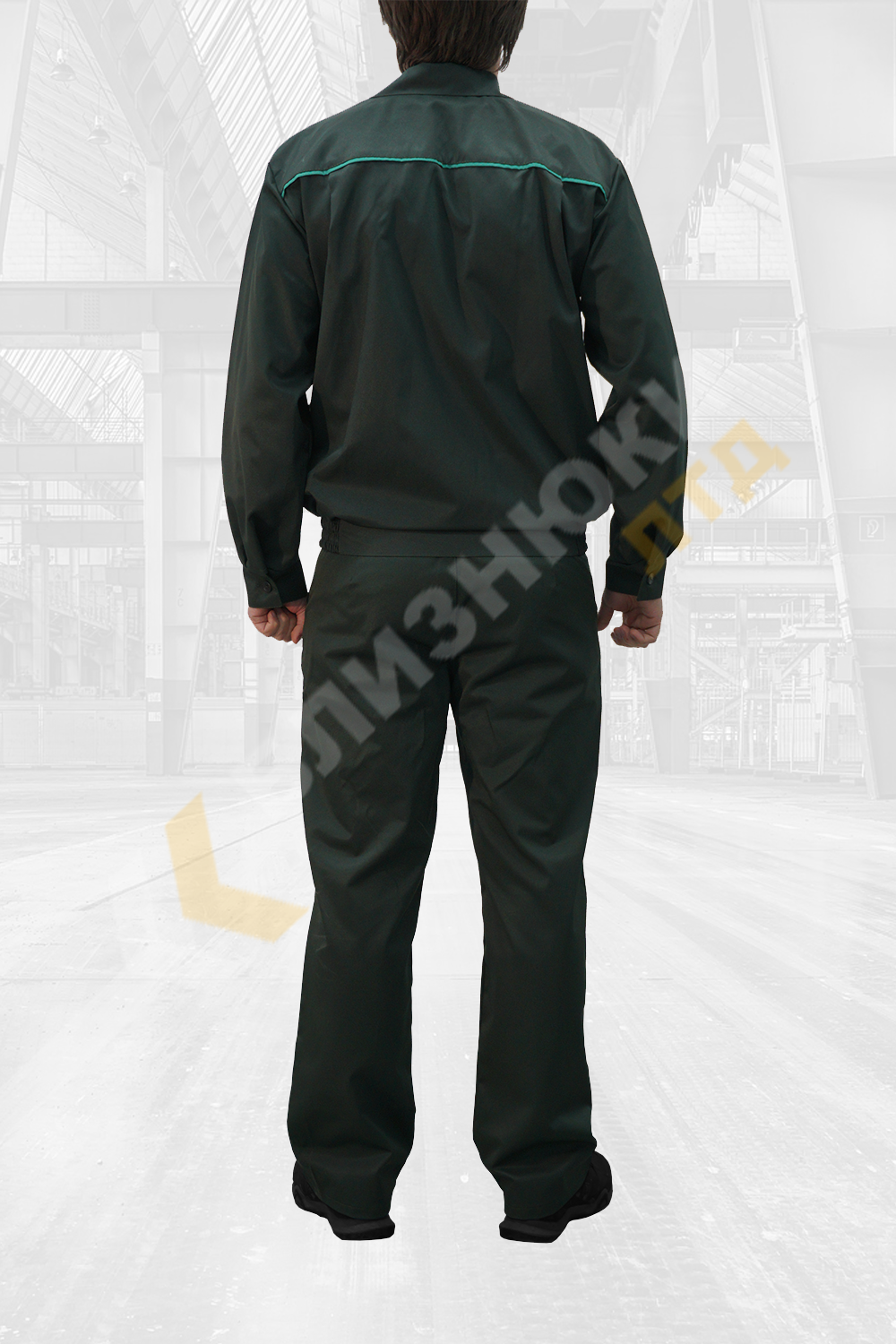 Куртка класична з притачним поясом з резинкою по бокам, комір відкладний, застібка на гудзиках з центральною потайною планкою, манжети на гудзиках. Нижні кишені скісні і одна пряма нагрудна. По кокетці на спині і грудях кант світло зеленого кольору 5мм.