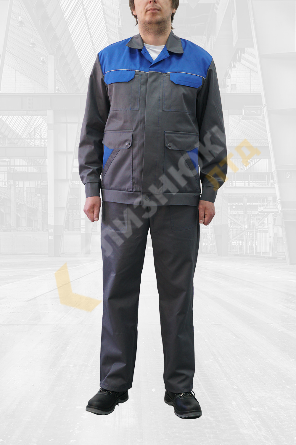Напівкомбінезон прямого покрою, бретелі регулюються по довжині пластиковими фастексами, гульфік на гудзиках. Кишені бічні накладні з сірим оздобленням, нагрудна перестрочена під ручку з клапаном на липучці, одна кишеня для інструментів, задня кишеня з клапаном на кнопці. Обшивка нагрудника, обшивка кишень, клапани, кишеня для інструментів волошкового кольору. Кант на нагруднику, кант на кишенях Змм світло-сірого кольору.