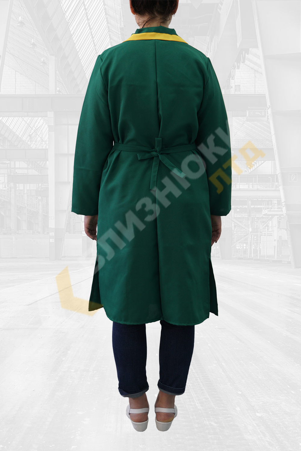 Халат з рел’єфами, прямий довгий рукав, застібка на гудзиках, дві кишені накладні, комір відкладний. На комірі та кишенях оздоблення.